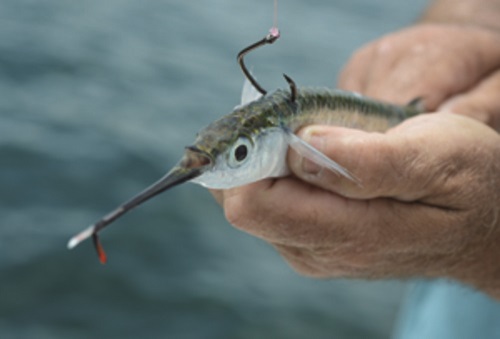 Capt. Tommy Pellegrin has a unique method of hooking blue runners and other baits that minimizes harm to the fish.