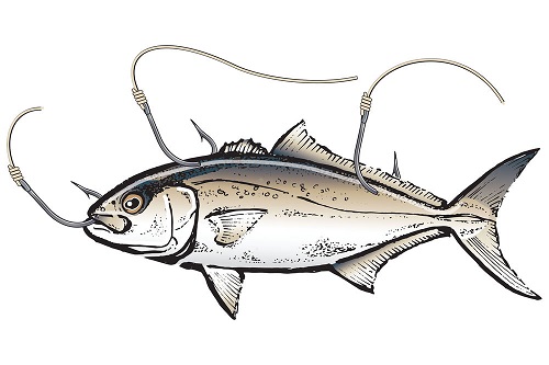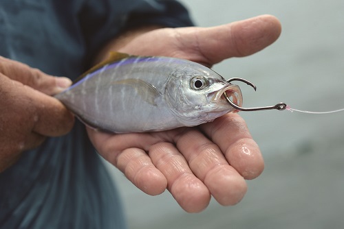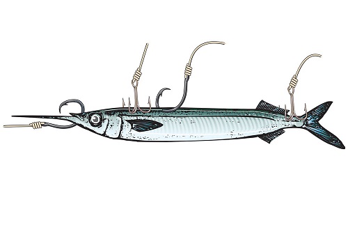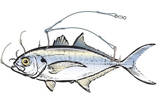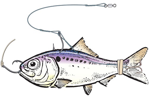 - A single J-hook such as a 7/0 Mustad 9175 through the back, ahead of the dorsal fin, allows you to troll, drift, bottomfish or use a kite.