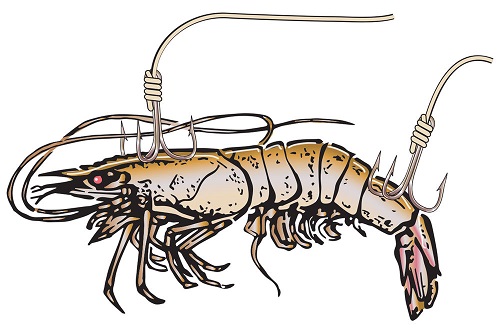 - Pin one hook of a snelled No. 3 Mustad KVD light-wire treble hook in the shell in the segment just before the tail. Avoid hooking too much of the meat.
