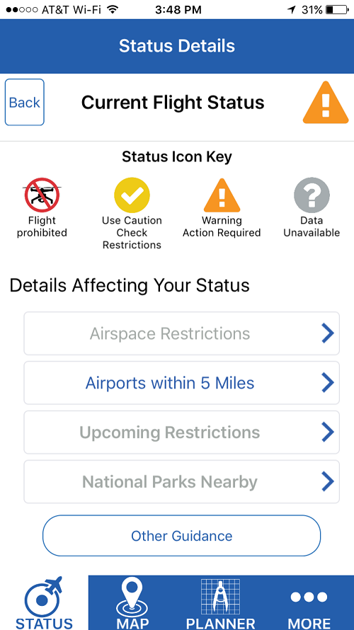 The FAA’s new B4UFLY smartphone app (below) shows drone no-fly zones, which include airports, security zones (including most of Washington D.C.), and temporary security zones, such as within 3 miles of stadiums within an hour of major sporting events. Under separate rules, areas administered by the National Park Service also prohibit drones, including national parks, national seashores, national monuments and national memorials. The state of Oregon has also banned the use of drones to aid any hunting or fishing, including advanced scouting.