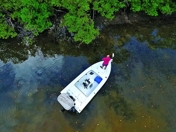 Although Fordyce’s TV show heavily utilizes drone footage, he eschews drone use to aid fishing. “I have use of half a dozen drones at any given time, but I’ve yet to use one to find fish or make my day easier, because I enjoy the hunt,” he says. Fordyce feels drones can diminish the inshore-fishing experience. “It’s like the days before GPS. I learned the Everglades, hundreds of bays and shorelines, by going slow. I learned more about the fish. I learned where the little-bit-deeper spots were with a push pole. With the drone, you might see where the fish are on one particular day, but you’re not learning about that topography, the intricacies of the flat [that] you learn if you pole it or go slow with a trolling motor.”